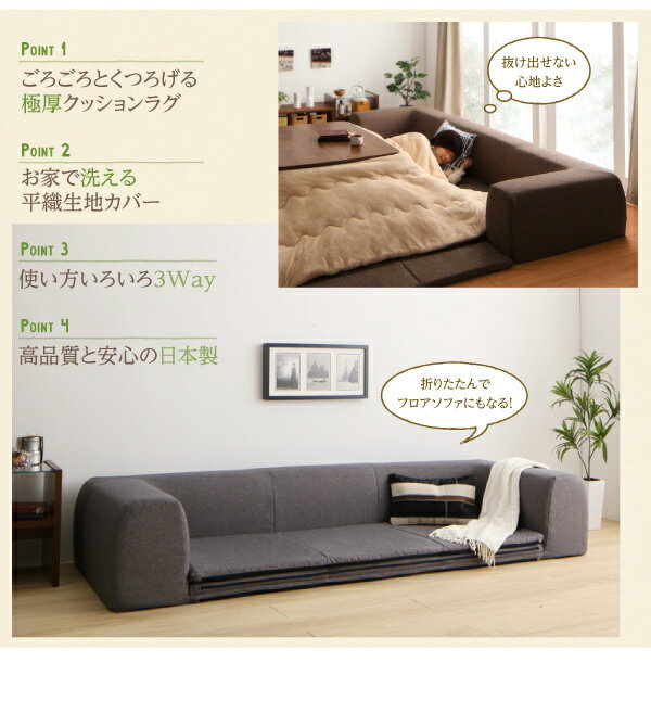 商品詳細 年中清潔 フロアソファになる洗えるクッションラグ 大 250×174 【サイズ】 大サイズ:(約)幅250×奥行174×高さ35cm (座面高3cm) 【商品重量】大サイズ:(約)24kg 【カラー】ネイビー、ブラウン、グレー、レッド 【素材】ポリエステル100%・ウレタンフォーム 【生産国】日本 ※サイズ・重量は概算となります。